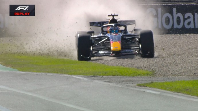 维斯塔潘在10号弯冲入砂石地,底板似乎有碎片飞出。