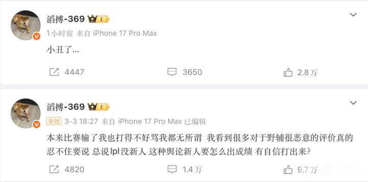 在3月2日TES被WBG淘汰一天后,369发布了一篇微博,力挺队内野辅选手:“本来比赛输了我也打得不好骂我都无所谓 我看到很多对于野辅很恶意的评价真的忍不住要说 总说lpl没新人 这种舆论新人要怎么出成绩 有自信打出来? ”