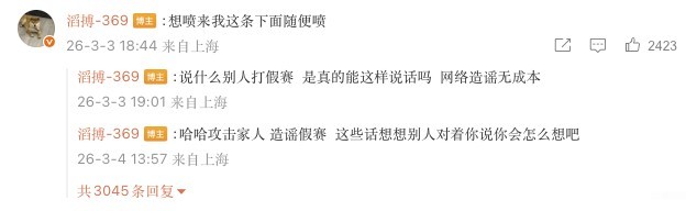 369还在那条微博的评论区激情对线,表示:“想喷来我这条下面随便喷”“说什么别人打假赛 是真的能这样说话吗 网络造谣无成本”“哈哈攻击家人 造谣假赛 这些话想想别人对着你说你会怎么想吧”。