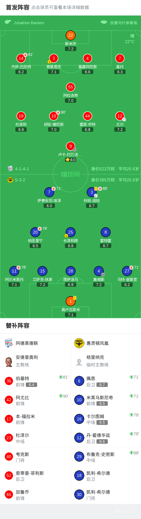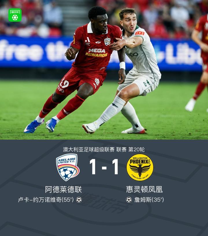 北京时间3月6日澳大利亚足球超级联赛 联赛 第20轮,阿德莱德联主场对阵惠灵顿凤凰。阿德莱德联卢卡-约万诺维奇破门。惠灵顿凤凰詹姆斯破门。最终比分阿德莱德联 1-1 惠灵顿凤凰。