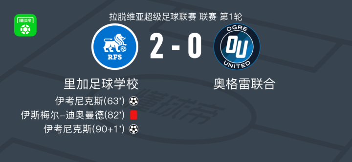 北京时间3月7日拉脱维亚超级足球联赛 联赛 第1轮,里加足球学校主场对阵奥格雷联合。里加足球学校伊考尼克斯梅开二度。最终比分里加足球学校 2-0 奥格雷联合。