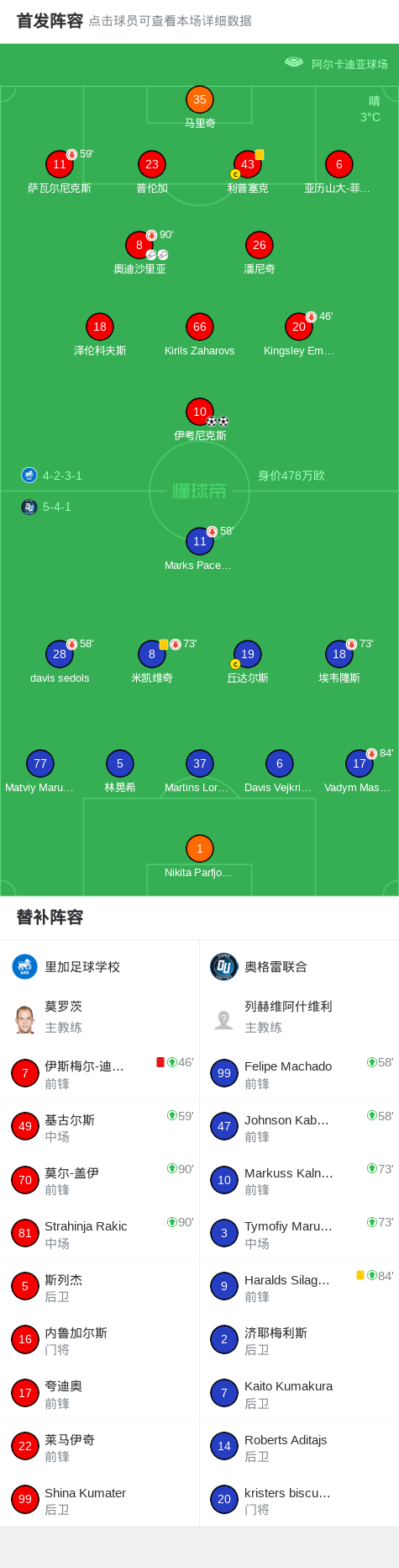 下半场补时第1分钟,里加足球学校球员奥迪沙里亚助攻伊考尼克斯打入一球。