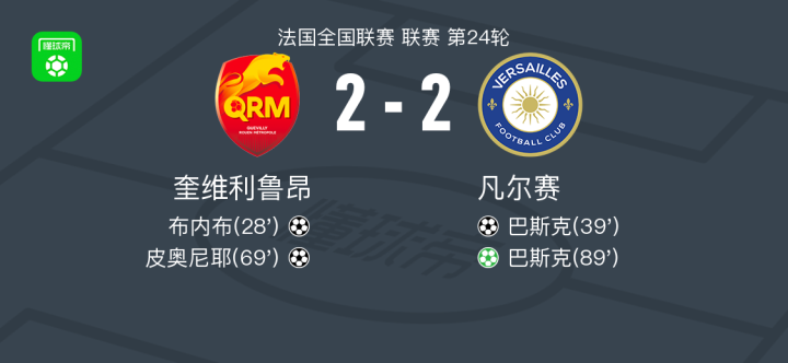 北京时间3月7日法国全国联赛 联赛 第24轮,奎维利鲁昂主场对阵凡尔赛。奎维利鲁昂布内布破门,皮奥尼耶破门。凡尔赛巴斯克梅开二度。最终比分奎维利鲁昂 2-2 维尔塞勒斯。