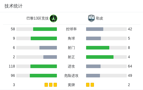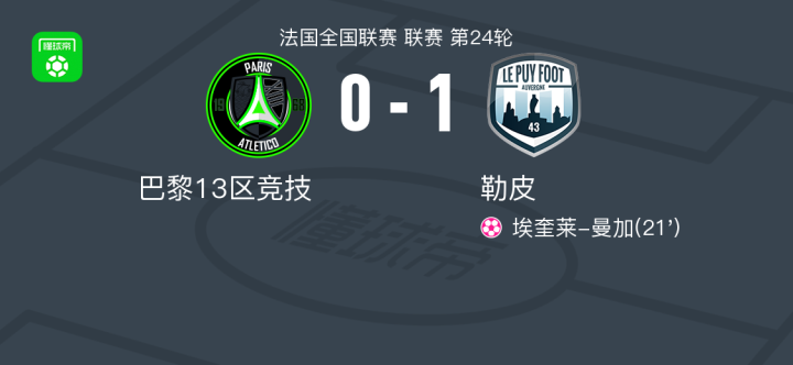勒皮1-0巴黎13区竞技战报bot @懂球帝03-07 04:26北京时间3月7日法国全国联赛 联赛 第24轮,巴黎13区竞技主场对阵勒皮。巴黎13区竞技埃奎莱-曼加自摆乌龙。最终比分巴黎13区竞技 0-1 勒皮。点击查看本场比赛详细数据>>点击查看法丙完整积分榜>>精彩瞬间第21分钟,巴黎13区竞技球员埃奎莱-曼加自摆乌龙。 球队阵容 技术统计 展开更多