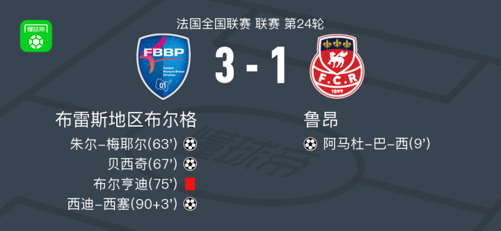 北京时间3月7日法国全国联赛 联赛 第24轮,布雷斯地区布尔格主场对阵鲁昂。布雷斯地区布尔格朱尔-梅耶尔破门,贝西奇破门,西迪-西塞破门。鲁昂阿马杜-巴-西破门。最终比分布雷斯地区布尔格 3-1 鲁昂。