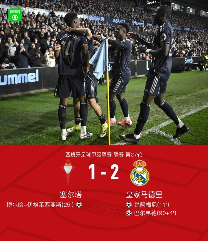 北京时间3月7日西班牙足球甲级联赛 联赛 第27轮,塞尔塔主场对阵皇家马德里。上半场,居莱尔助攻,楚阿梅尼破门。斯韦德贝里传球,博尔哈扳平比分。下半场补时阶段,巴尔韦德完成绝杀。全场比赛结束,皇马2-1击败塞尔塔。