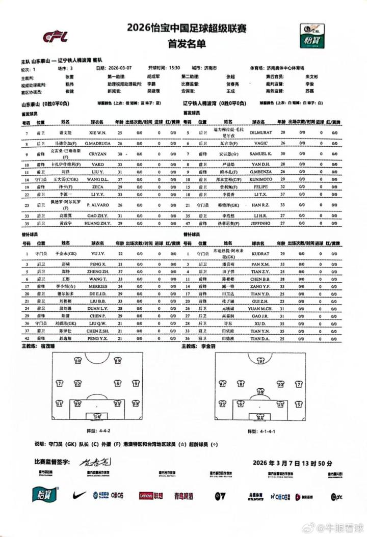 北京时间3月7日15:30,中超联赛第一轮,山东泰山坐镇主场迎战辽宁铁人,本场比赛主裁判是张雷,VAR是甄伟,赛前双方公布首发: