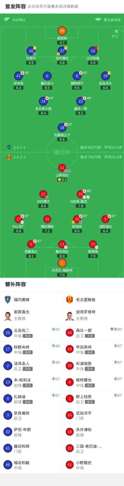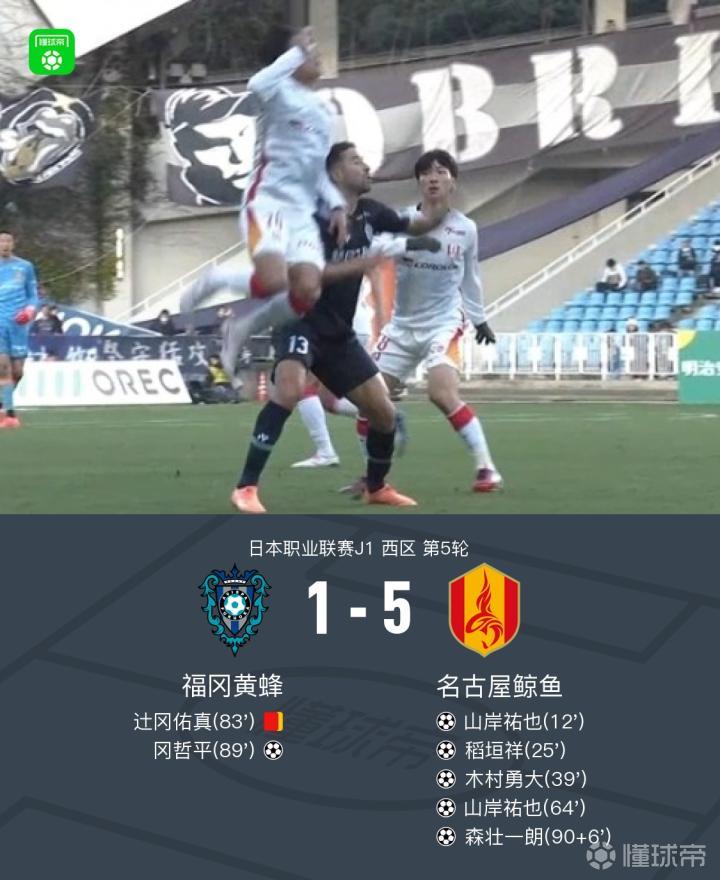 北京时间3月7日日本职业联赛J1 西区 第5轮,福冈黄蜂主场对阵名古屋鲸鱼。福冈黄蜂冈哲平破门。名古屋鲸鱼山岸祐也梅开二度,稻垣祥破门,木村勇大破门,森壮一朗破门。最终比分福冈黄蜂 1-5 名古屋鲸鱼。