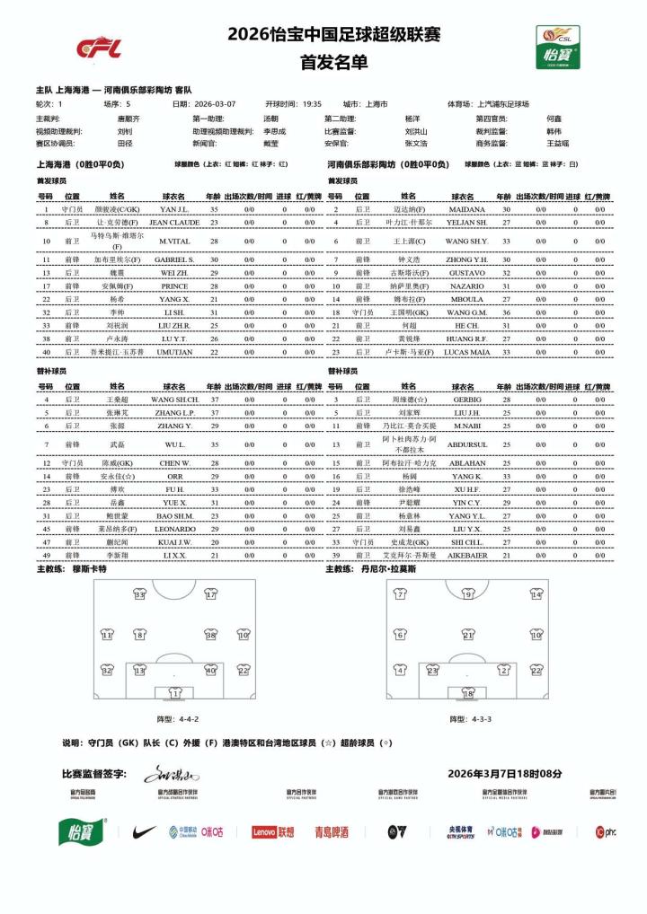 2026怡宝中超联赛第1轮上海海港VS河南俱乐部...河南足球俱乐部 @懂球帝03-07 18:312026怡宝中超联赛第1轮 上海海港VS河南俱乐部彩陶坊 首发及替补队员名单 📺咪咕视频APP(二台俱乐部官方直播间)/移动高清/咪视界/五星体育展开更多