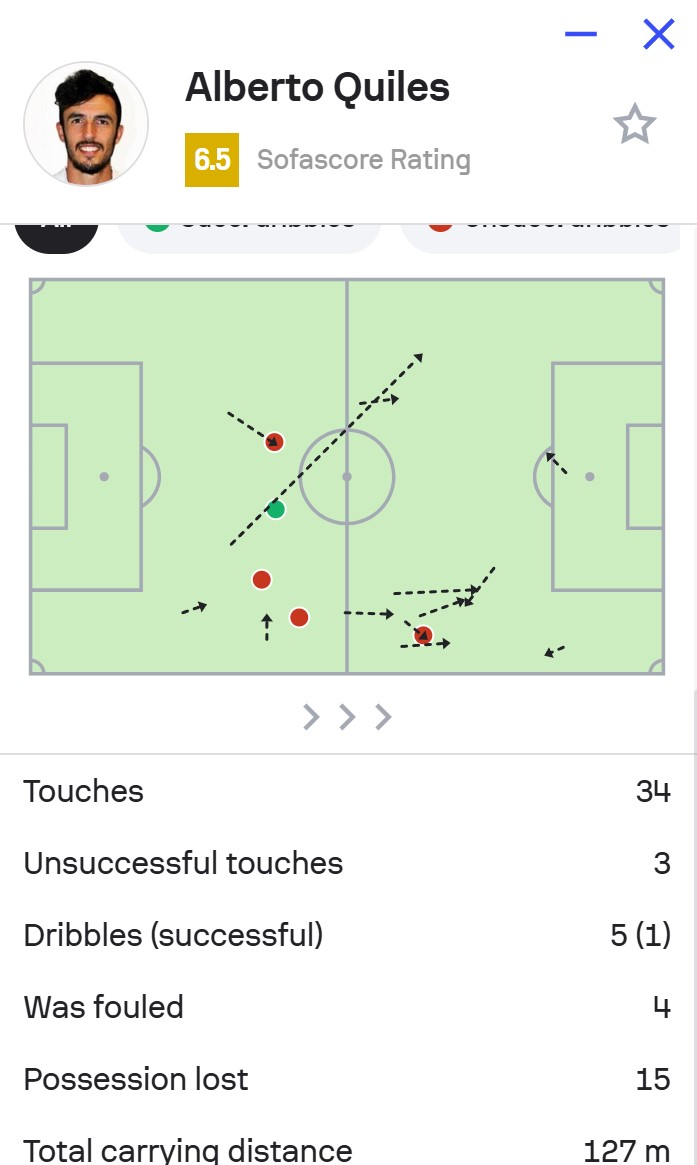 看了天津津门虎0比0重庆铜梁龙的比赛,我来瞎嘚啵几句吧。 赛前我对这场比赛的预期不高,预测1-0或1-1,结果打出0-0,没感到意外。看到转播画面里一位小姐姐在看台上打哈欠,我这边也秒跟了一个。 印象最深刻的是,基莱斯每次拿球都有三四名对方的球员过来围追堵截,真把我们鸽鸽当梅西防啊。图3数据也直观反映了这一情况,基莱斯丢失球权达到15次,5次盘带4次失败。基莱斯身价当中占比最高的应该是射术、决断和临门一脚的镇定,远离球门的鸽鸽,价值只能打个折扣了。 新来的中后卫科尔多瓦,球风朴实,防守技术扎实。只是,三中卫体系下,最忌讳的就是三名中后卫出球都不好。如果科尔多瓦出球能力只是中规中矩,那么是不是可以给他配一个Overlapping Center Back(OCB),更多的破线传球,或者引球向前帮助边翼打开进攻通道。甚至更大胆点,继续前插,在前场缺少爆点的情况下,作为潜在的free man,为进攻带来新的变量。 从图2的评分来看,左边路熄火了。大家都知道,三中卫体系最重要的位置就是两个边翼位,决定了阵容上限。首发两个边翼位年龄都在30岁往上,如何保持机动力是关键。 已经看到有人在骂了,真服了,这才第一轮。我还是相信于指导,他的调整纠错能力很强。