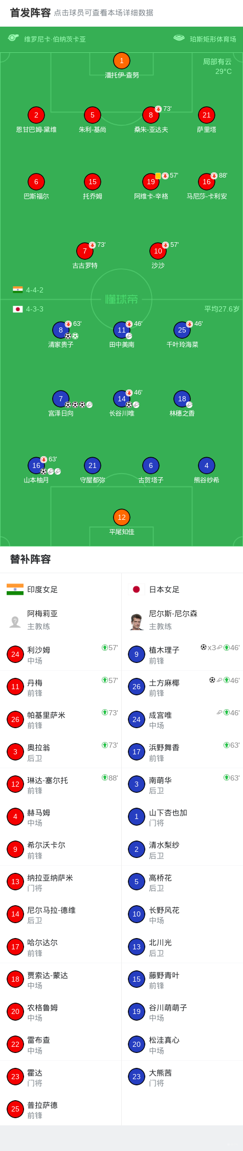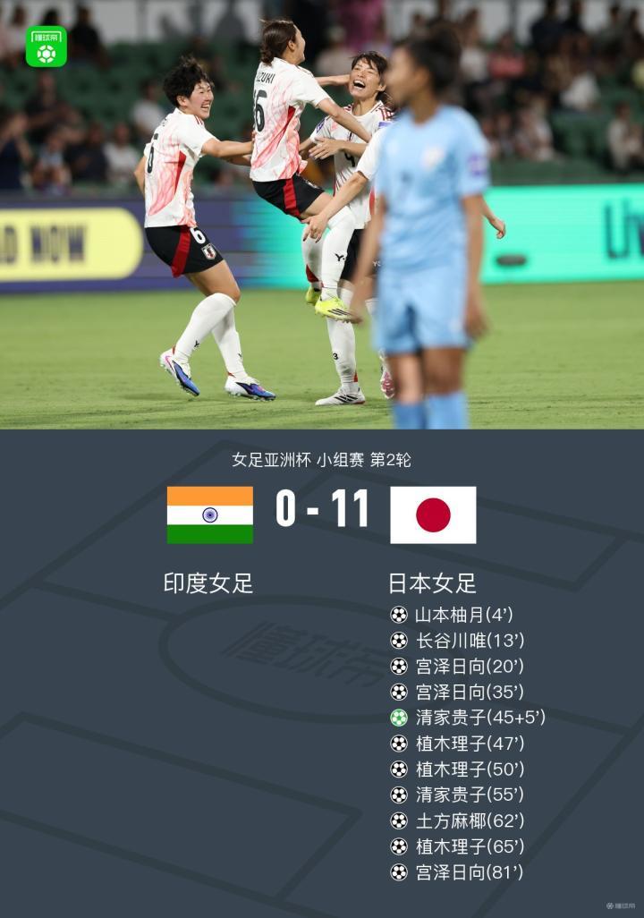 北京时间3月7日女足亚洲杯 小组赛 第2轮,印度女足对阵日本女足。本场比赛宫泽日向、植木理子3射1传,清家贵子双响,山本柚月1射2传,土方麻椰、长谷川唯传射。最终日本女足11-0战胜印度女足提前出线。