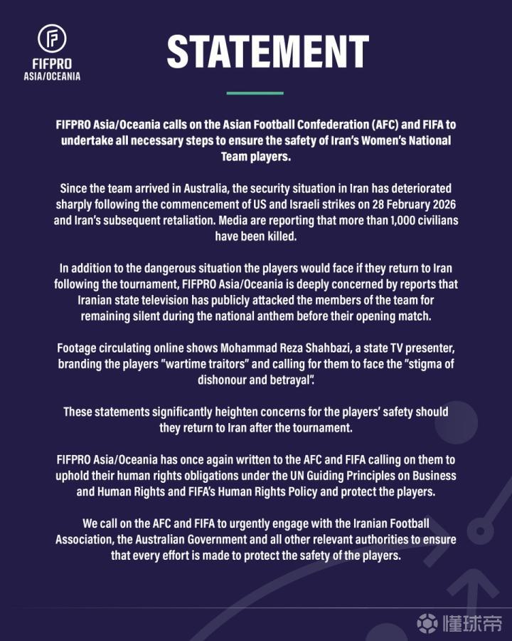 FIFPRO作为全球职业足球运动员的代表组织,敦促负责2026年女足亚洲杯的相关机构保障伊朗队球员的人身安全。国际足联(FIFA)和亚足联(AFC)被呼吁应“采取一切必要措施,确保伊朗女足国家队球员的安全”。