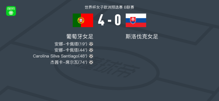 北京时间3月8日世界杯女子欧洲预选赛 B联赛,葡萄牙女足对阵斯洛伐克女足。葡萄牙女足安娜-卡佩塔梅开二度,Carolina Silva Santiago破门,杰茜卡-席尔瓦破门。最终比分葡萄牙女足 4-0 斯洛伐克女足。