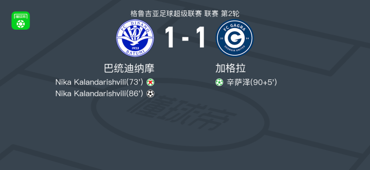 北京时间3月8日格鲁吉亚足球超级联赛 联赛 第2轮,巴统迪纳摩主场对阵加格拉。巴统迪纳摩Nika Kalandarishvili破门。加格拉辛萨泽破门。最终比分巴统迪纳摩 1-1 加格拉。