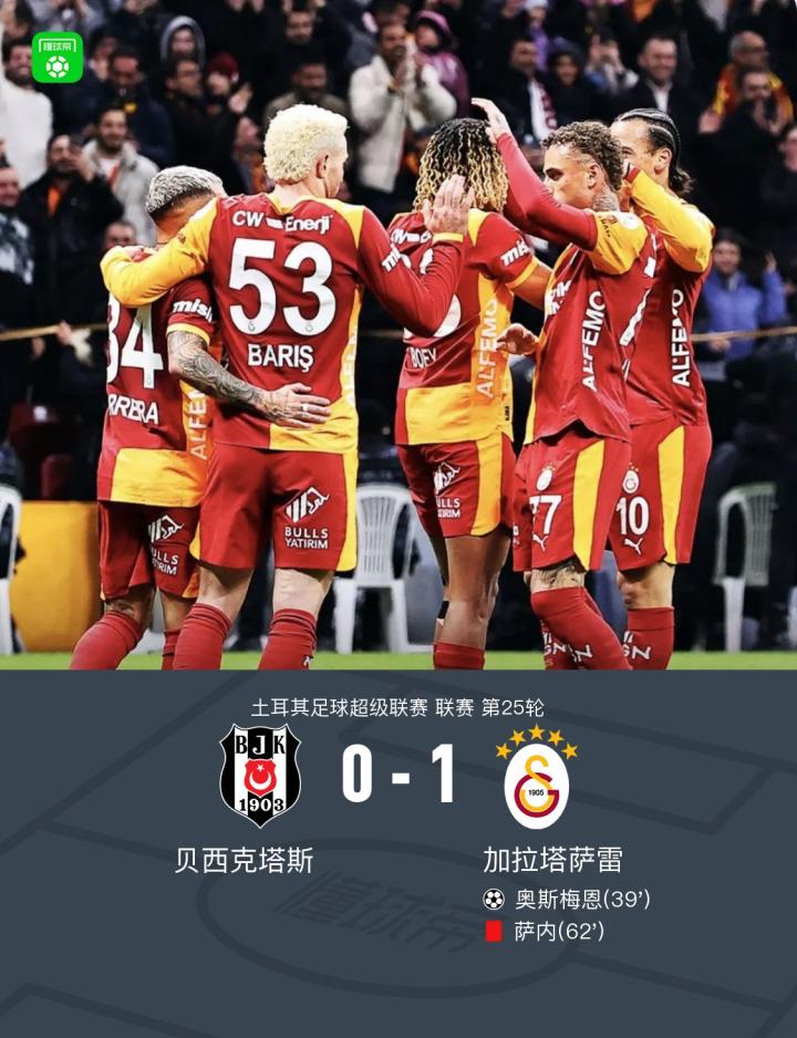 贝西克塔斯0-1加拉塔萨雷,奥斯梅恩破门,萨内染红