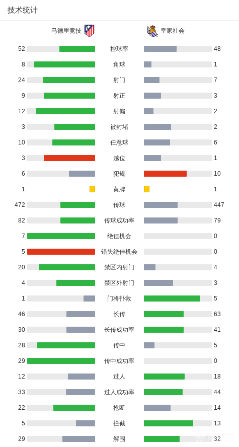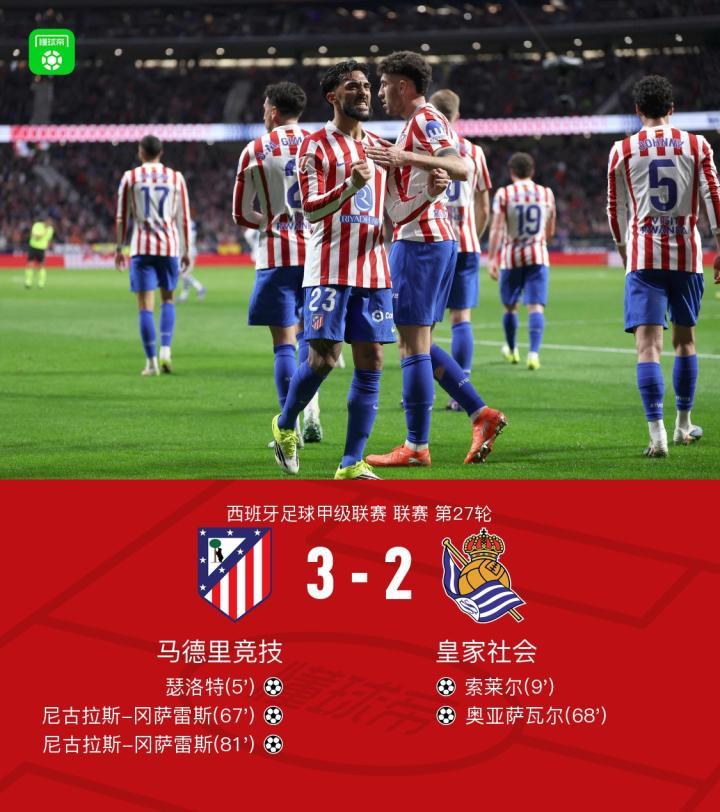 北京时间3月8日1:30,西甲第27轮继续进行,马德里竞技坐镇利雅得航空大都会球场迎战皇家社会,本场主裁判为科尔德罗。上半场,瑟洛特凌空垫射破旧主,索莱尔推射闪电扳平。下半场,格列兹曼脚后跟助攻尼古拉斯-冈萨雷斯破门,奥亚萨瓦尔劲射闪电扳平,紧接着尼古拉斯-冈萨雷斯甩头制胜梅开二度。最终,马竞3-2击败皇家社会。