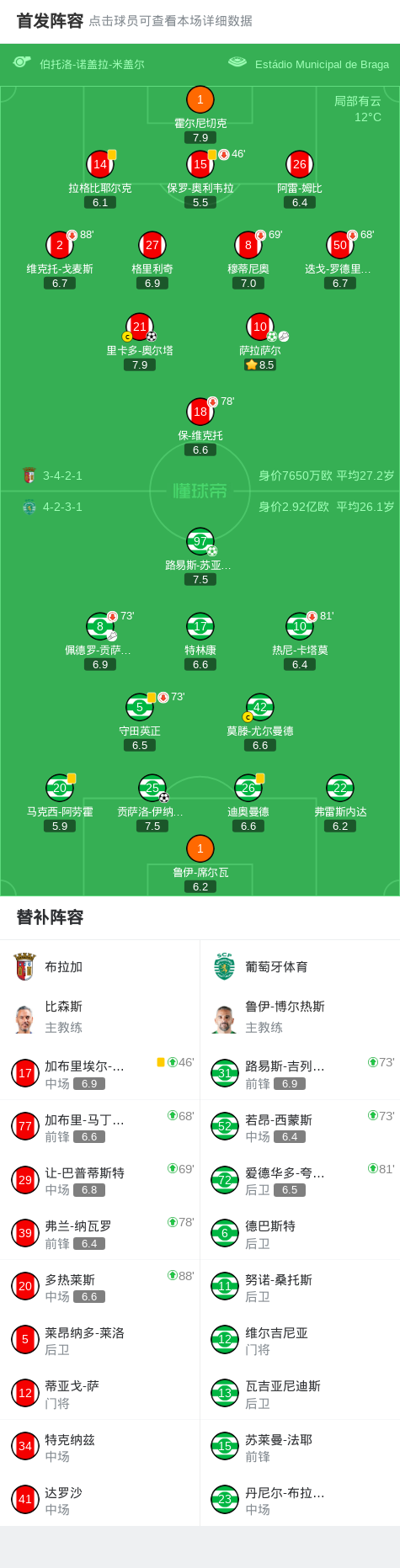 第34分钟,布拉加球员萨拉萨尔助攻里卡多-奥尔塔打入一球。