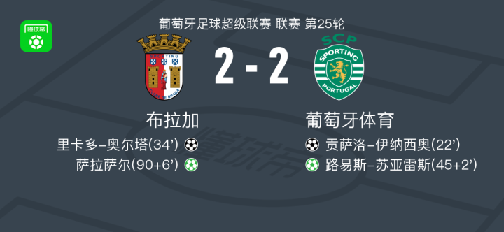 北京时间3月8日葡萄牙足球超级联赛 联赛 第25轮,布拉加主场对阵葡萄牙体育。布拉加里卡多-奥尔塔破门,萨拉萨尔破门。葡萄牙体育贡萨洛-伊纳西奥破门,路易斯-苏亚雷斯破门。最终比分布拉加 2-2 葡萄牙体育。
