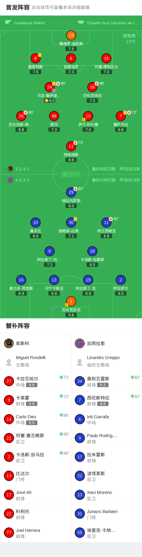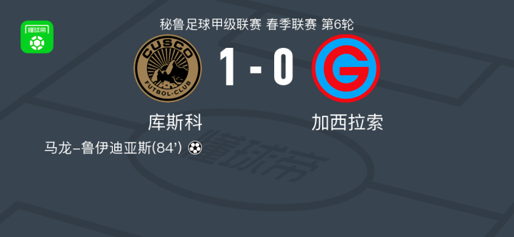 库斯科1-0加西拉索,马龙-鲁伊迪亚斯绝杀战报bot @懂球帝03-08 09:54北京时间3月8日秘鲁足球甲级联赛 春季联赛 第6轮,库斯科主场对阵加西拉索。库斯科马龙-鲁伊迪亚斯破门。最终比分库斯科 1-0 加西拉索。点击查看本场比赛详细数据>>点击查看秘鲁甲完整积分榜>>精彩瞬间第84分钟,库斯科球员马龙-鲁伊迪亚斯打入一球。 球队阵容 技术统计 展开更多
