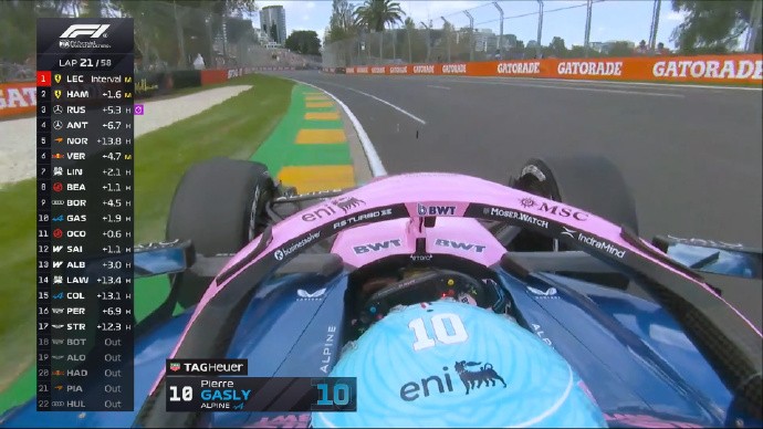第21圈:加斯利超越奥康,但两人之间有一些碰撞