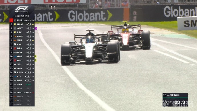 第28圈:拉塞尔超越汉密尔顿来到榜首,汉密尔顿随后完成了进站