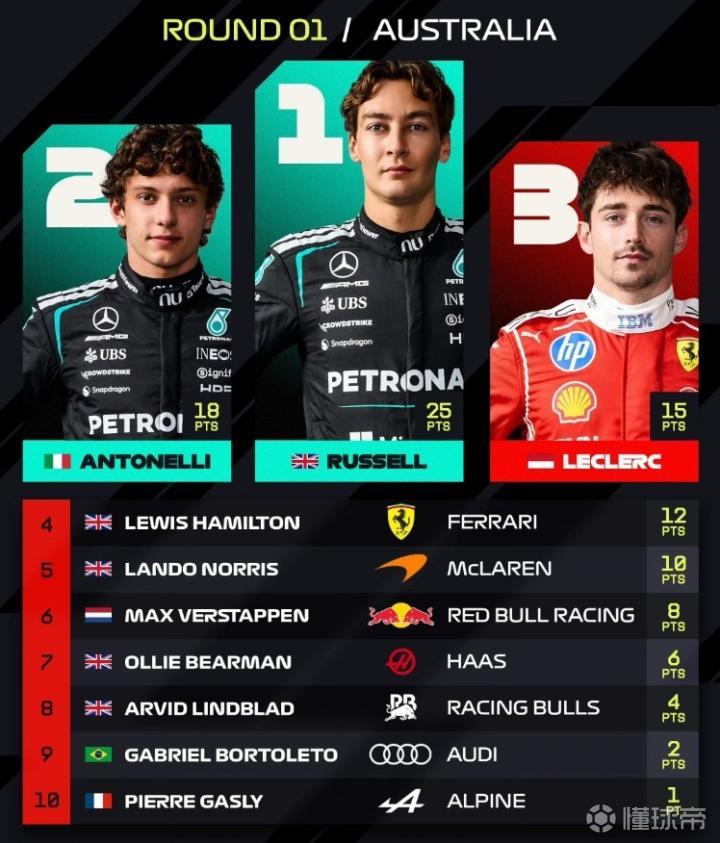 北京时间3月8日,F1澳大利亚大奖赛正赛结束,最终拉塞尔杆位夺冠,安东内利第2,勒克莱尔第3,汉密尔顿第4,诺里斯第5,维斯塔潘第6,贝尔曼第7,林德布拉德第8,博托莱托第9,加斯利第10。