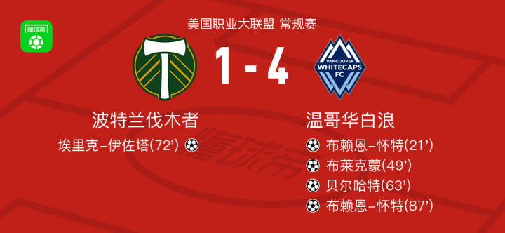 温哥华白浪4-1大胜波特兰伐木者取美职联3连胜,布赖恩-怀特双响,贝尔哈特传射