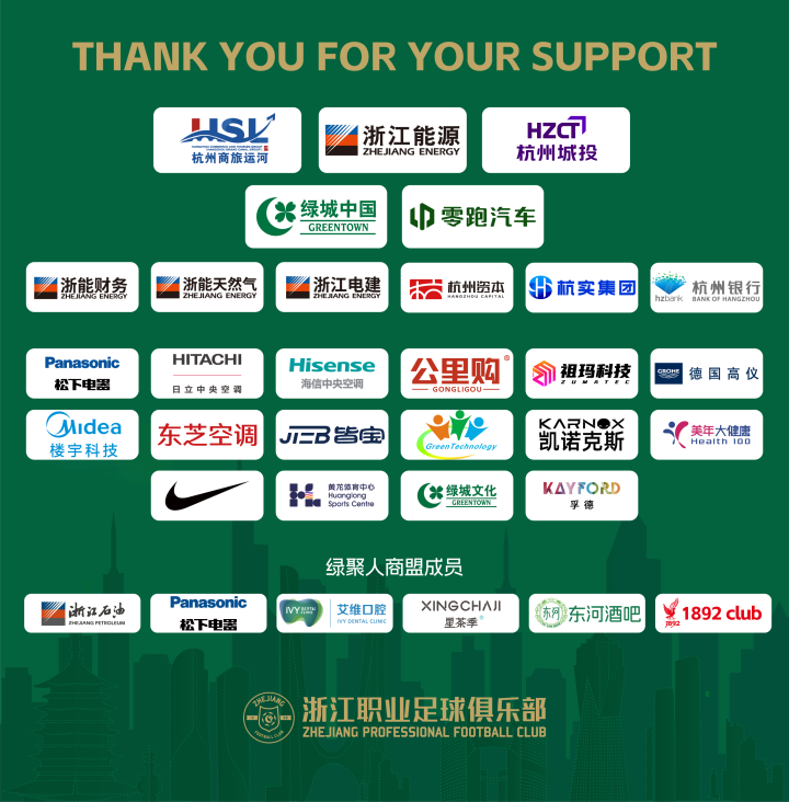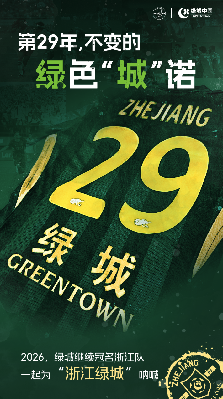 新赛季,浙江队将继续冠以“绿城”之名,双方携手迈入第29个年头。这也意味着,“浙江绿城”的呐喊声将继续响彻黄龙体育中心。感谢绿城中国,将最宝贵的年华写进了浙江足球的编年史。愿这抹绿色,永远飘扬在浙江足球的最前线!