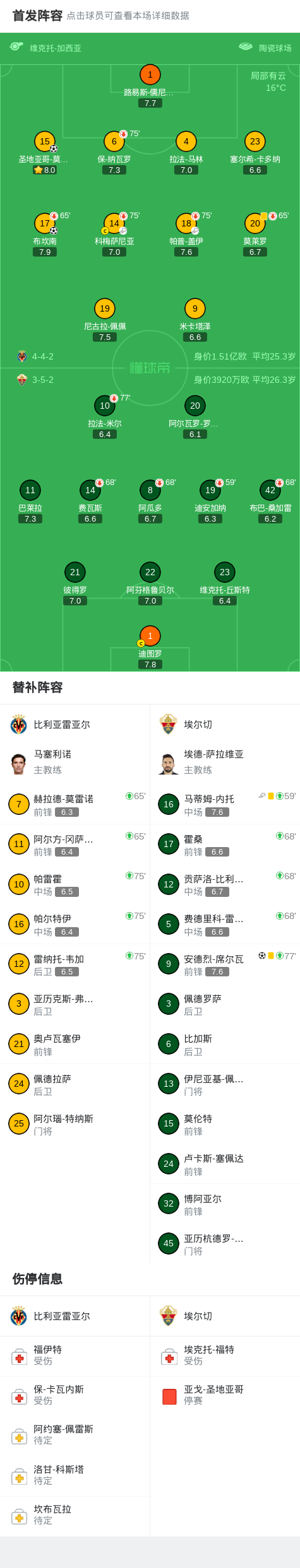 比利亚雷亚尔2-1埃尔切,圣地亚哥-莫里尼奥、布坎南破门
