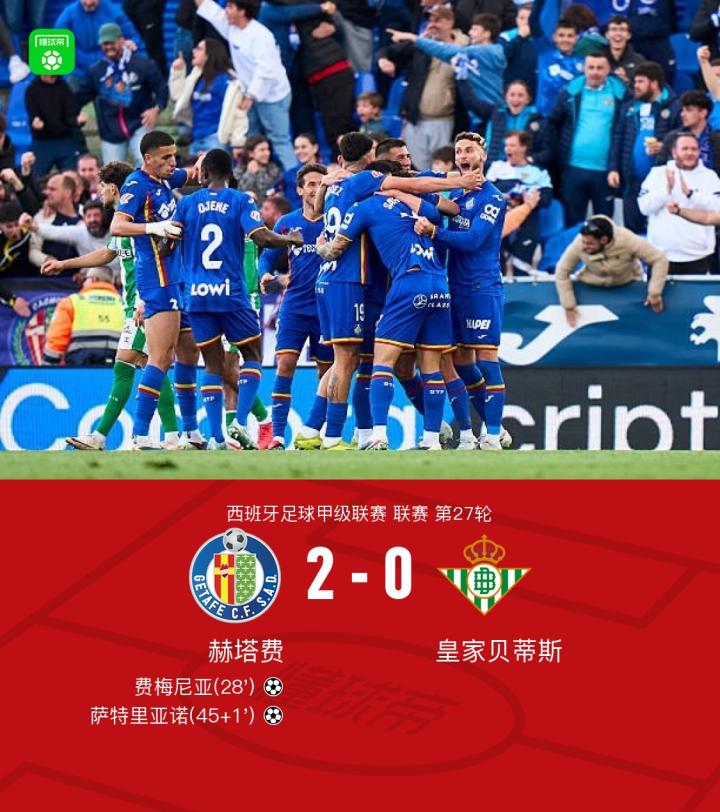 赫塔费2-0皇家贝蒂斯,费梅尼亚破门,萨特里亚诺建功