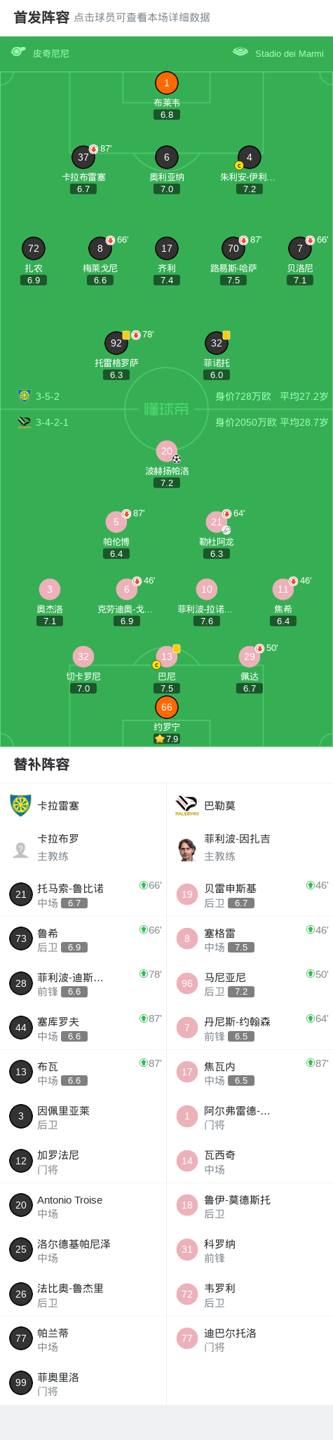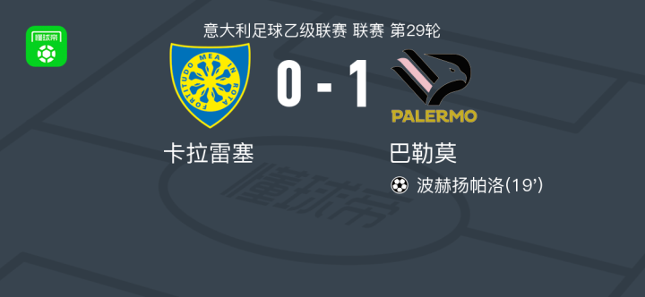 巴勒莫1-0卡拉雷塞,波赫扬帕洛一击制胜战报bot @懂球帝03-09 02:13北京时间3月9日意大利足球乙级联赛 联赛 第29轮,卡拉雷塞主场对阵巴勒莫。巴勒莫波赫扬帕洛破门。最终比分卡拉雷塞 0-1 巴勒莫。点击查看本场比赛详细数据>>点击查看意乙完整积分榜>>精彩瞬间第19分钟,巴勒莫球员勒杜阿龙助攻波赫扬帕洛打入一球。 球队阵容 技术统计 展开更多