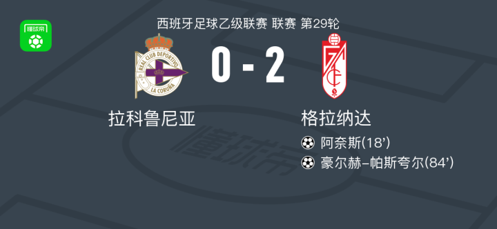 北京时间3月9日西班牙足球乙级联赛 联赛 第29轮,拉科鲁尼亚主场对阵格拉纳达。格拉纳达阿奈斯破门,豪尔赫-帕斯夸尔破门。最终比分拉科鲁尼亚 0-2 格拉纳达。