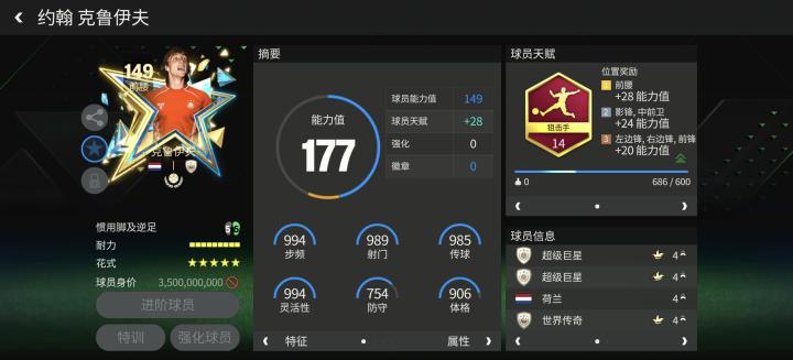 克鲁伊夫的巅峰荣耀球员卡配备了狙击手天赋。花式方面,五星花式星级与高级油炸丸子花式的配置让他的前场持球进攻能力依旧保持在版本顶级。
