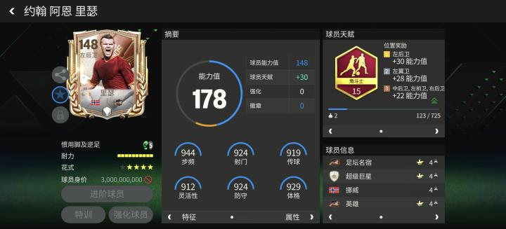 巅峰荣耀球员里瑟配备了角斗士天赋,对他攻守两端的多项关键数据都有提升。四星花式星级搭配马赛回旋花式,这让身材高大的里瑟边路突破更加犀利。