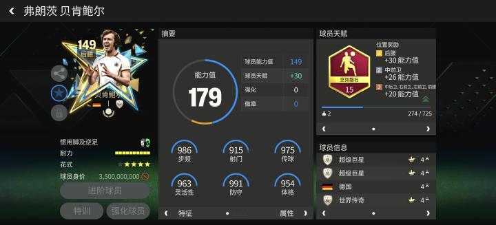贝肯鲍尔在本次活动中推出的球员卡配备了坚如磐石天赋。花式方面,马赛回旋让他拥有了一定的中场摆脱能力,他依旧是一名表现全面的后腰。