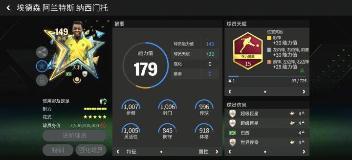 贝利的巅峰荣耀球员卡配备了强力锋霸天赋,大大增强了他的终结能力。花式方面高级油炸丸子搭配五星花式星级同样确保了他的盘带突破效率。