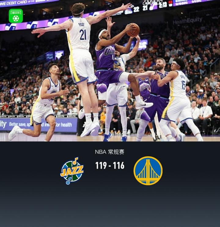 第四节,开节爵士希布韦连续内线得分再度领先10分,随后勇士佩顿、桑托斯站出来得分止血,勇士梅尔顿持续冲框造杀伤得分追平比分,关键时刻勇士梅尔顿持续冲框不中,爵士辛森三分命中,哈克莱斯罚球领先4分,勇士梅尔顿三分续命,爵士哈克莱斯罚球全中领先3分,留给勇士最后1.7秒,桑托斯绝平三分不中,最终爵士119-116战胜勇士。