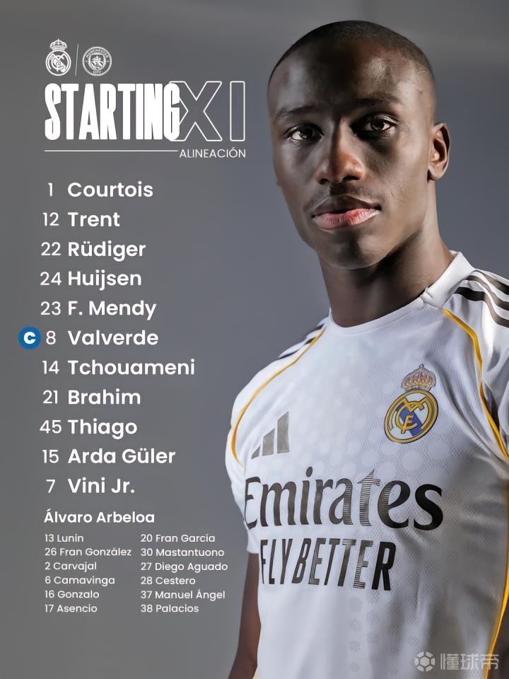 皇马首发:1-库尔图瓦、12-阿诺德、22-吕迪格、24-赫伊森、23-费兰-门迪、8-巴尔韦德、14-楚阿梅尼、21-卜拉欣-迪亚斯、45-皮塔奇、15-居莱尔、7-维尼修斯