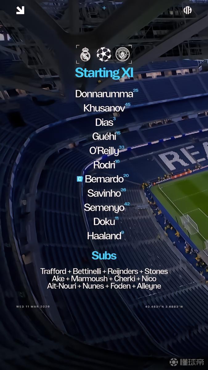 曼城首发:25-多纳鲁马、45-胡桑诺夫、3-鲁本-迪亚斯、15-格伊、33-奥赖利、16-罗德里、20-B席、26-萨维尼奥、42-塞门约、11-多库、9-哈兰德