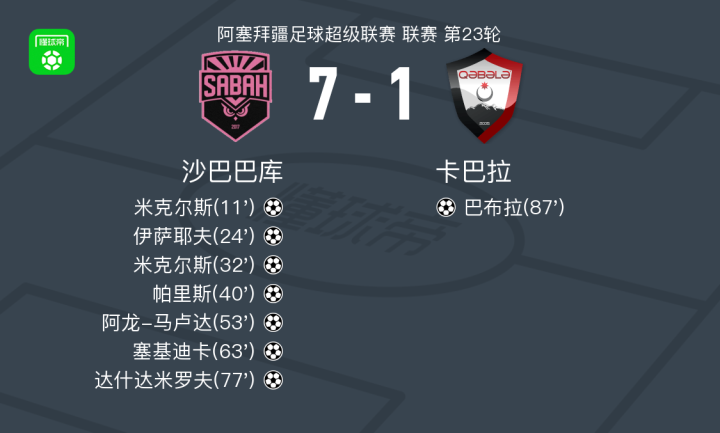 北京时间3月10日阿塞拜疆足球超级联赛 联赛 第23轮,沙巴巴库主场对阵卡巴拉。沙巴巴库米克尔斯梅开二度,伊萨耶夫破门,帕里斯破门,阿龙-马卢达破门,塞基迪卡破门,达什达米罗夫破门。卡巴拉巴布拉破门。最终比分沙巴巴 7-1 卡巴拉。