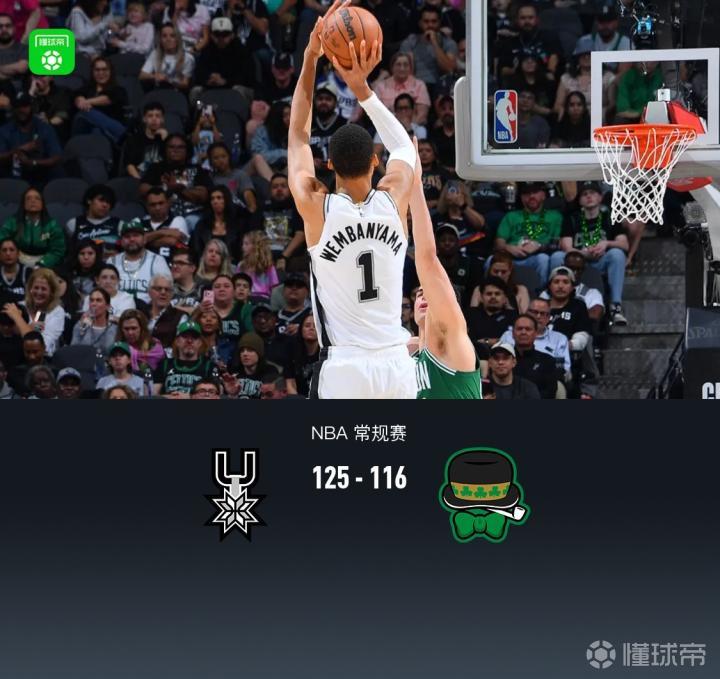 第四节,开节凯尔特人塔图姆连续得分追至3分,马刺文班亚马、凯尔登三分再度拉开分差,凯尔特人哈珀、谢尔曼得分回应迫近至1分,紧跟马刺文班亚马、瓦塞尔一波12-0领先至13分,随后凯尔特人哈珀、塔图姆一波8-0追至5分再生悬念,马刺卡斯尔、福克斯站出来彻底收下比赛,最终马刺125-116战胜凯尔特人。