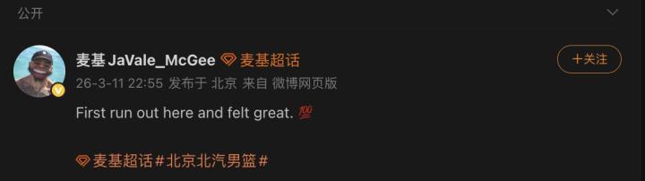 北京时间3月11日,CBA常规赛第二阶段的比赛正式打响,北京主场88-55战胜四川。赛后,完成CBA首秀的北京队外援麦基在个人社交媒体表示:感觉非常好。