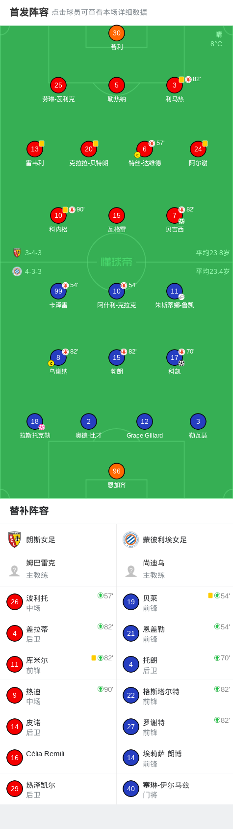 北京时间3月12日法国女子甲组联赛 联赛 第17轮,朗斯女足主场对阵蒙彼利埃女足。朗斯女足贝吉西破门。蒙彼利埃女足科凯破门,拉斯托克勒自摆乌龙。最终比分朗斯女足 2-1 蒙彼利埃女足。