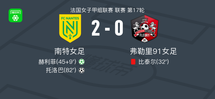 南特女足2-0弗勒里91女足,赫利菲建功,托洛巴锦上添花