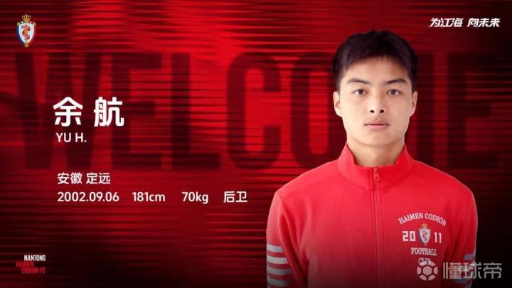 经与球员本人协商一致,余航正式加盟南通海门珂缔缘足球俱乐部。余航,出生于2002年9月6日,身高181cm,体重70公斤,司职后卫,安徽定远人。新赛季余航将身披23号战袍随队征战中乙联赛,欢迎他的到来!