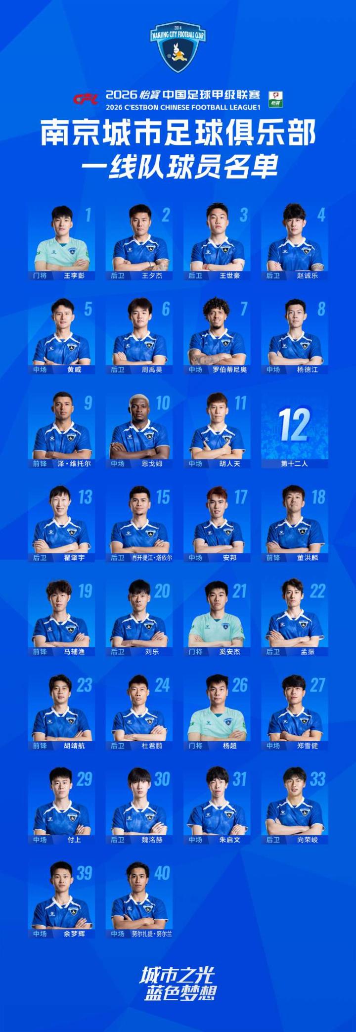 列阵|南京城市2026中甲联赛一线队全家福、大名单