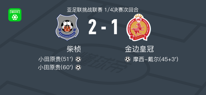 北京时间3月12日亚足联挑战联赛 1/4决赛次回合,柴桢对阵金边皇冠。柴桢小田原贵梅开二度。金边皇冠摩西-戴尔破门。最终比分柴桢 2-1 金边皇冠。两回合总比分柴桢6-2金边皇冠。
