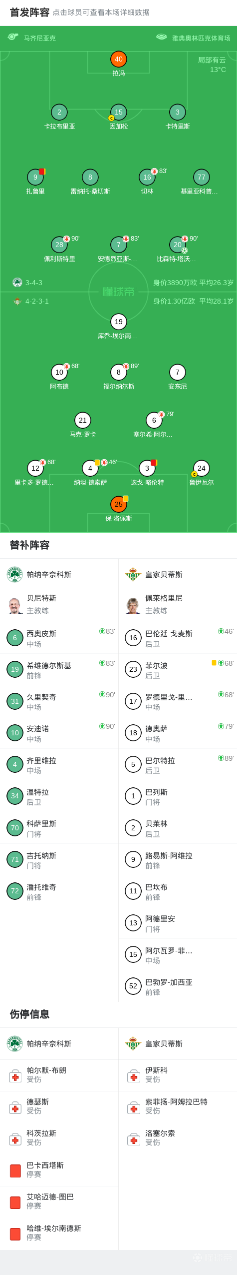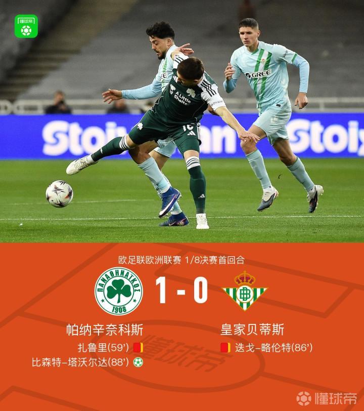 北京时间3月13日欧足联欧洲联赛 1/8决赛首回合,帕纳辛奈科斯对阵皇家贝蒂斯。下半场扎鲁里两黄一红被罚离场,希维德尔斯造点,塔沃尔达点射打入制胜球,迭戈-略伦特两黄一红被罚离场。最终比分帕纳辛奈科斯 1-0 皇家贝蒂斯。