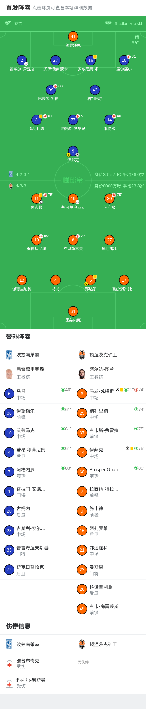 北京时间3月13日欧洲协会联赛 1/8决赛首回合,波兹南莱赫对阵顿涅茨克矿工。波兹南莱赫伊沙克破门。顿涅茨克矿工马龙-戈梅斯破门,内弗顿破门,伊萨克破门。最终比分波兹南莱赫 1-3 顿涅茨克矿工。