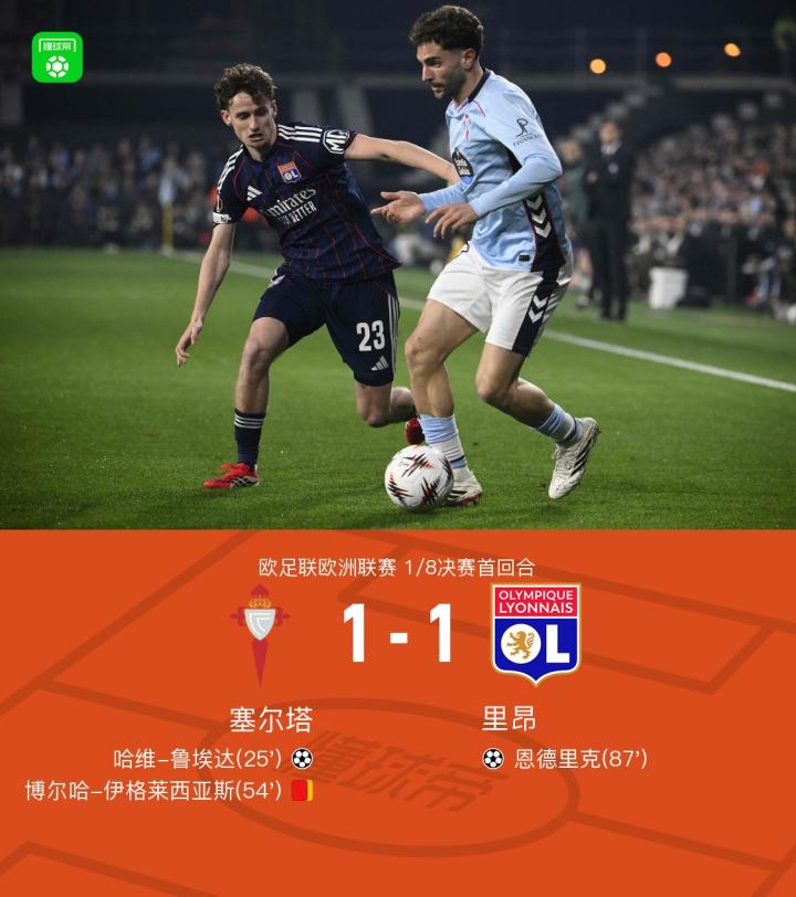 北京时间3月13日欧足联欧洲联赛 1/8决赛首回合,塞尔塔对阵里昂。塞尔塔哈维-鲁埃达破门。里昂恩德里克破门。最终比分塞尔塔 1-1 里昂。
